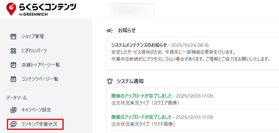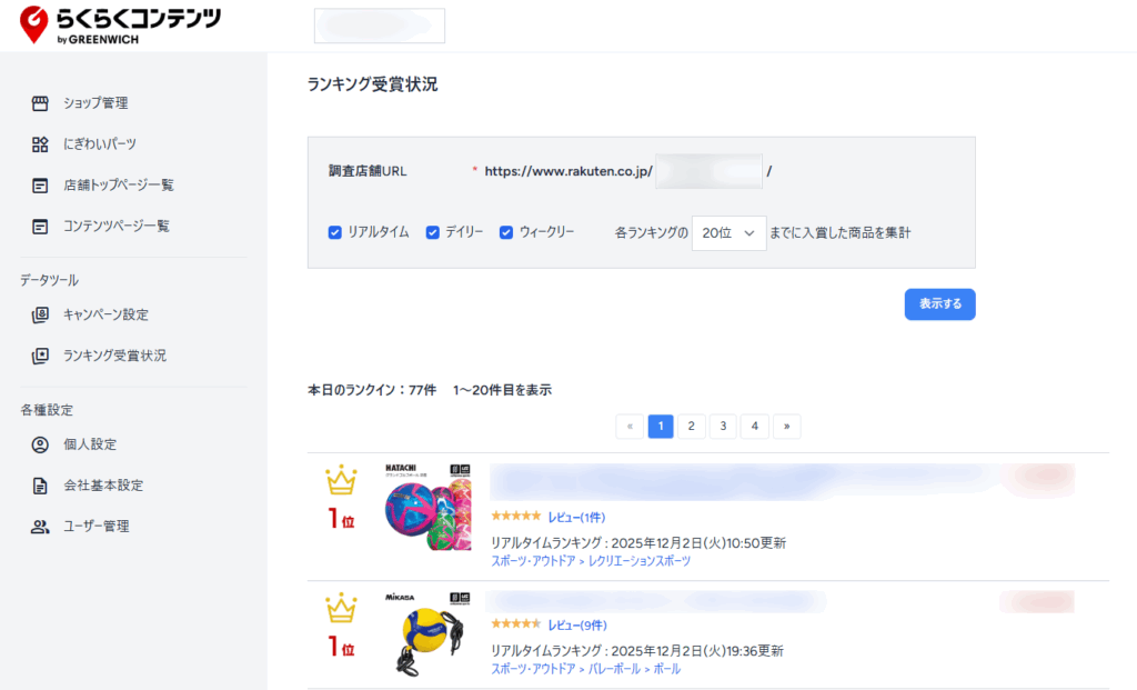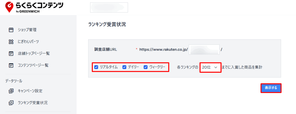 ランキング受賞状況を確認する 2025.12.03 らくらくコンテンツではランキング受賞している商品と順位を確認できます。 管理画面にログインし、ランキング受賞状況をクリックします。 ランキング受賞ページにて、調査したい店舗のショップURLを入力し※対象ランキングにチェックを入れ、調査したい順位を選択し、表示するボタンをクリックします。※ショップ管理に登録されている店舗URLがデフォルトで入力されています。 受賞商品と順位が表示されます。また、入賞しているランキングとカテゴリも確認できます。