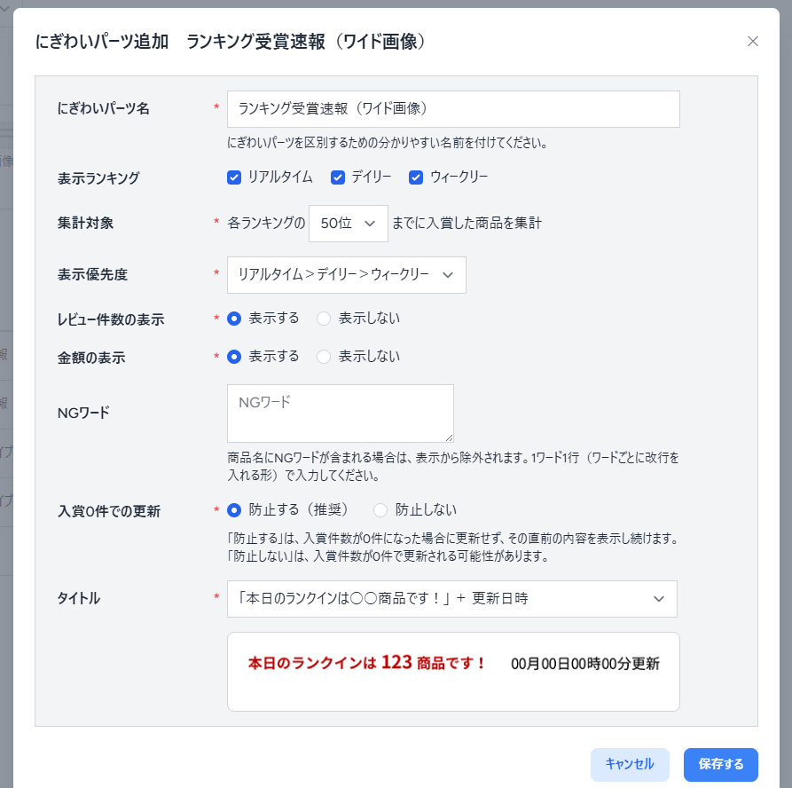 | 入賞0件での表示 | 入賞が0件になった場合、更新せず直前の内容を表示するか、更新して表示するかを選択できます。 |